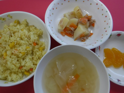 ~今日のお給食~ ・鶏のからあげ ・春雨サラダ ・ごはん ・えのきとわかめのみそ汁 ・オレンジ ~今日のおやつ~ ・お月見団子 幼稚部さんで白玉だんご…