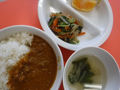 ~今日のお給食~ ・キーマカレー ・小松菜サラダ ・わかめスープ ・オレンジ ~今日のおやつ~ ・シュガートースト 今日は、キリン組さんが育てた枝豆も…