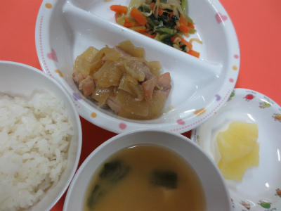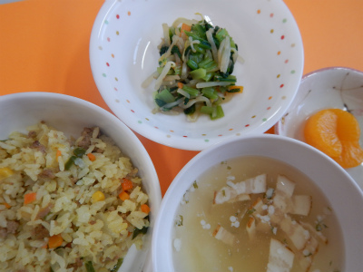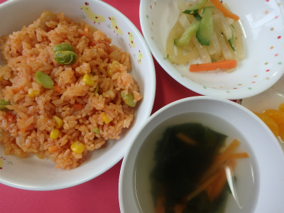 ~今日のお給食~ ・チキンライス ・大根サラダ ・わかめとにんじんのコンソメスープ ・みかん ~今日のおやつ~ ・りんごゼリー ・おせんべい