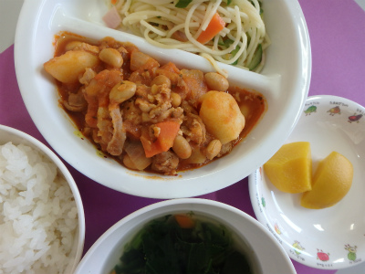 ~今日のお給食~ ・ポークビーンズ ・スパゲティのサラダ ・ごはん ・ほうれんそうとコーンのコンソメスープ ・モモ ~今日のおやつ~ ・シュガートースト
