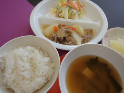 ~今日のお給食~ ・肉じゃが ・コールスローサラダ ・ごはん ・わかめと豆腐のみそ汁 ・パイン ~今日のおやつ~ ・かぼちゃのカップケーキ