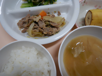 ~今日のお給食~ ・さけのちゃんちゃん焼き ・切干大根の煮物 ・ごはん ・ほうれんそうと油揚げのみそ汁 ~今日のおやつ~ ・バナナヨーグルト ・おせんべい