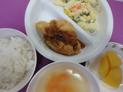 ~今日のお給食~ ・カレイのフライ ・マカロニサラダ ・ごはん ・たまねぎとにんじんのコンソメスープ ・モモ ~今日のおやつ~ ・大学芋