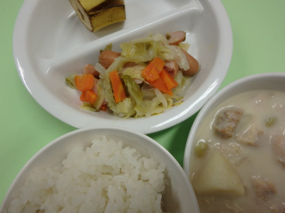 ~今日のお給食~ ・豚肉のカレー風味炒め ・こまつなサラダ ・ごはん ・豆腐とわかめのみそ汁 ~今日のおやつ~ ・あげぱん