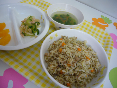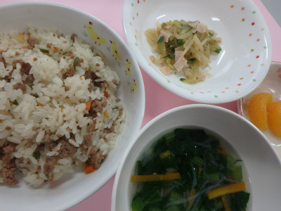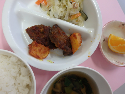 ~今日のお給食~ ・チーズハンバーグ ・コールスローサラダ ・ごはん ・小松菜と油揚げのみそ汁 ・パイン ~今日のおやつ~ ・ひじきのおにぎり