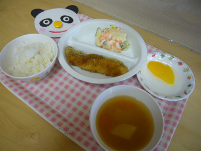 ~今日のお給食~ ・鮭フライ ・ポテトサラダ ・ごはん ・じゃがいもとにんじんのみそ汁 ・モモ ~今日のおやつ~ ・チーズのホットケーキ