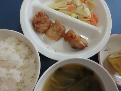 ~今日のお給食~ ・鶏のからあげ ・マカロニサラダ ・ごはん ・ほうれんそうとたまねぎのみそ汁 ・バナナ ~今日のおやつ~ ・マシュマロコーンフレーク