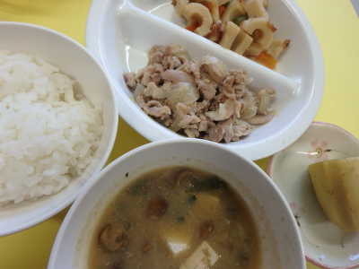 ~今日のお給食~ ・豚肉のしょうが焼き ・ちくわの煮物 ・ごはん ・豆腐となめこのみそ汁 ・バナナ ~今日のおやつ~ ・オレンジゼリー ・カルシウムウエハース