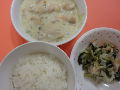 ~今日のお給食~ ・クリームシチュー ・キャベツとベーコンの炒め物 ・ごはん ~今日のおやつ~ ・フルーツポンチ ・カルシウムウエハース