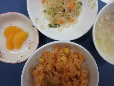 ~今日のお給食~ ・マーボーなす ・わかめのサラダ ・ごはん ・えのきとにんじんのみそ汁 ・オレンジ ~今日のおやつ~ ・ジャムサンド