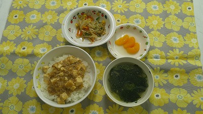 ~今日のお給食~ ・マーボー豆腐丼 ・もやしの中華サラダ ・ごはん ・中華スープ(えのきたけ・わかめ・ねぎ) ・みかん ~今日のおやつ~ ・おせんべい ・ビスケット…