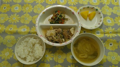 ~今日のお給食~ ・ちくわの磯辺揚げ ・ひじき煮 ・ごはん ・味噌汁(ほうれんそう・たまねぎ・とうふ) ・モモ ~今日のおやつ~ ・マシュマロコーンフレーク ・牛乳…