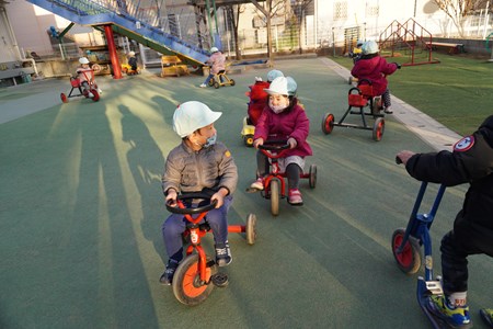 今日イルカ組のお友達は午後、園庭で遊びました! イルカ組のお友達は三輪車が人気で脚でこぐ三輪車や2人乗り三輪車など色々な種類の三輪車に乗って楽しんでいます♪ ショベ…