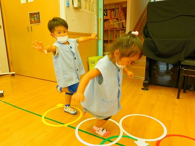 パンダ組のお友達は運動会でケンケンパやでんぐり返しを 披露します!! 毎日少しずつ取り組み、楽しみながら練習をしています♪ 「ケンケンパ♪」と歌いながら 上手に行う…