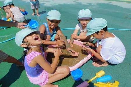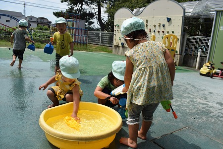 今日幼稚部のお友達はみんなで 水遊びをしました♪ みんなで水を掛け合ったり ボールやおもちゃを水に浮かべ 楽しんでいました!