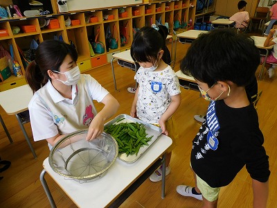 今日幼稚部のお友達は食育活動を行い 給食に出るさやえんどうむきをしました♪ 栄養士の先生のお話をよく聞いて むきかたを教わりました★ &…