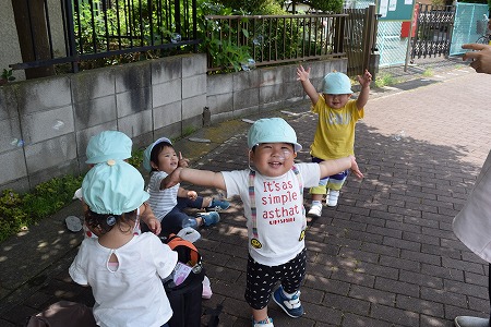 今日ペンギン組のお友達は 治水緑地にお散歩に行きました♪ 木陰でしゃぼんだま遊びをしました! 先生がしゃぼんだまを「フー」っと吹くと 「わあー!!」ととってもうれしそうに追いかけ…