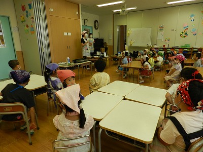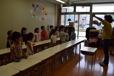 今日は幼稚部のお友達とイルカ組のお友達で夏祭りの練習をしました(^0^) 最初は列に並んで先生のお話を聞きました! ライオン組さんの太鼓に合わせて…