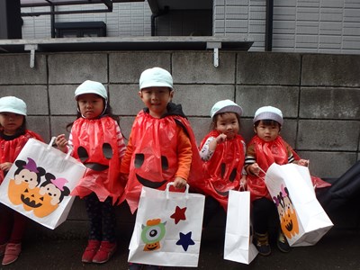 今日は子ども達がとーっても楽しみに待っていたハロウィン♪ おばけの仮装をし手作りのバックを持って出発です!! 保育部のお友達は近所の方のお家に行きました(^○^) お家を装飾して…