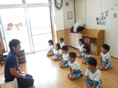 今日幼稚部のお友達は音楽指導がありました(^○^) 運動会も終わり、次は発表会に向け練習が始まります♪ パンダ組のお友達は和太鼓に挑戦します!! まずは和太鼓バチの持ち方、叩き方などのお話を …