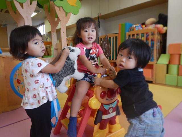 今日の保育部のお友だちは、室内で滑り台やソフトブロックを使って遊びました♪ 幼稚部のお友だちは、午後は雨がやんだので園庭で遊びました(*^^*) 車の乗り物に乗った…
