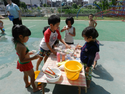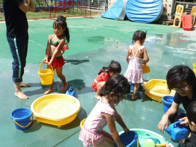 今日は保育部、幼稚部みんなで 水遊びをしました(*^。^*) バケツやジョウロにお水を溜め、 お友達や自分にジャーっとかけて楽しんだり 水鉄砲を使い誰が一番遠くに飛ばせるかゲームをしたりと と…