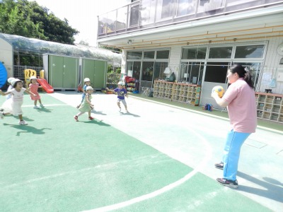 本日は園庭に出て遊びました。 中当てドッチボールをしたり、色鬼をして遊びました。 お茶飲み休憩をはさみながらたくさん戸外で遊びましたよ。