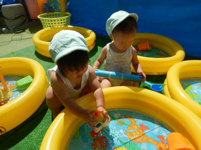 今日ラッコ組のお友達は水遊びをしました(^^)/ だんだんと水に慣れてきて、笑顔で遊べる子が 増えてきました♪ 「パチャパ…