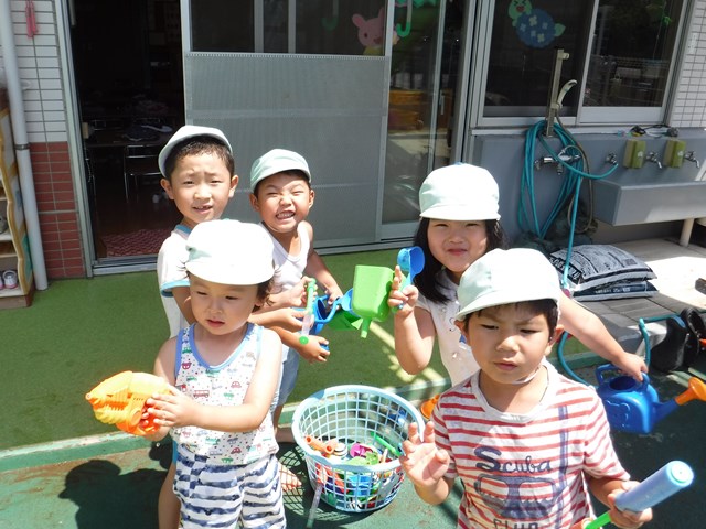 今日は水遊びをしました。 外はとても暑かったので子ども達は水に触ると 「気持ちいい」と言いながらお友達と水をかけ合ったり、 入れ物に水を溜めて流したりして楽しんでいました。