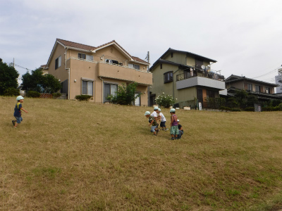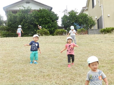 本日ペンギン組さんは治水緑地へ遊びに行きました。 先生と駆けっこ ちょっと高いところに上って山登り気分。 両手を双眼鏡のようにして覗いたり、口に手を当ててヤッホーと叫んだり 元気に走り回ったペンギン組さんでした。