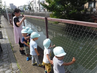 本日ペンギン組さんは辰井川沿いをお散歩しました。 カメさんや水鳥さんを観察です。 まだ長距離歩けない子は交代でカートです。 治水緑地で給水タイム。 たっぷりお散歩を楽しみました♪ 夕方避難訓練を行いました。…