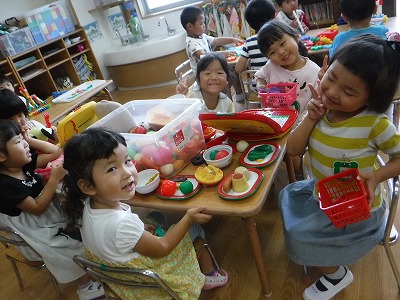 本日パンダ組は英語教室のあと、室内遊びをしました。 女の子にはおままごとが人気で 男の子はブロック遊びを楽しんでいましたよ。 敬老の日の制作も楽しんで作っていました。