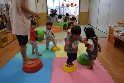 本日保育部さんは巧技台と色々な形の台に乗って遊びました。 ラッコ組さんは巧技台を登ったりくぐったり、 ペンギン組さんは平らではない台の感触を楽しんでいました。 幼稚部さんはポケモン指人形や色々なブロックで遊…