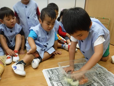 パンダ組さんは今カタツムリを飼っています。 今日は雨で外遊びが出来ないのでじっくりお世話をしました。 給食室の先生からキャベツや人参の残りを貰ってエサにしています。 みんなで少しずつカゴの中に置いていきます。 小さな生き…
