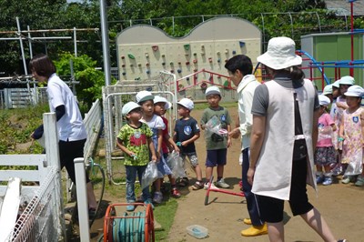 本日、幼稚部さんは午前中水遊びをしました。 運動会の練習や夏祭りのスペースの為に遊具を片付けたので とても広くなった園庭で水をかけあっていました。 午後、パンダ組さんはマーチングの練習をしました。 まずはおやつの補給です…