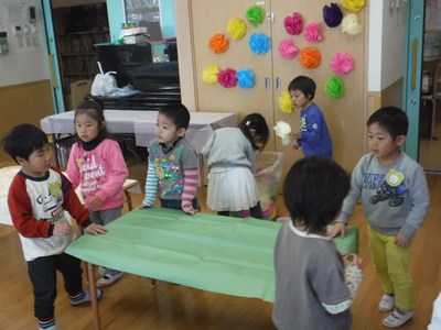 本日はライオン組さんのお別れバイキングを行いました。 イルカ組さんからライオン組さんまでの4クラスが参加しましたよ。 その準備と後片付けをキリン組さんが行いました。 テーブルクロスを敷いたり壁に花飾りを付けたり椅子を並べ…