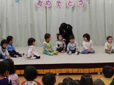 本日なかよし保育園では進級式を行いました。 ラッコ組さんはお返事と「だるまさんが・・・」の絵本のマネをしました。 ペンギン組さんは食べ物のカードの絵を見て答えていました。 「ともだちのわぉ!」も見せてくれましたよ。 イル…