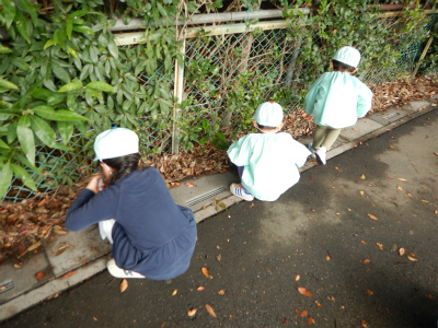 今日は天気が良かったのでみんなお外に行きました。 ラッコ組さんは園周り、ペンギン組さんは治水緑地へのお散歩。 イルカ組さんからライオン組さんまでは桃の木公園まで行きました。 落ち葉に枯れ枝、ラッコ組さんには…