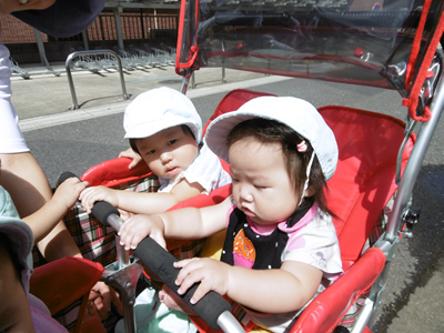 午前中らっこ組は治水緑地公園へお散歩。 2人乗りと4人乗りの乳母車で出発! 現地では草木に触れ合ったりシャボン玉をしたりしました。 先生が捕まえたセミに興味深々! お散歩のたびに、新しい発見がありますね♪