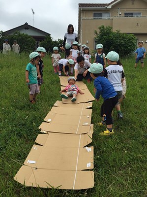 治水緑地公園@パンダ組さん♪ ダンボールで土手すべり、みんな力を合わせて!! 「先生も一緒にすべろうよ♪♪」 体操の選手のように滑った後のポーズも決まっています。 …