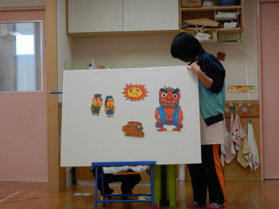 豆まき会を園で行いました(*^_^*) 節分のパネルシアターを見たり豆まきの歌を歌ったり して楽しみました! 手作りのお面を付けて準備完了!(^^)! 升にお豆を入…