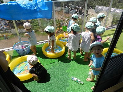 昨日の雨と風が嘘のように今日は晴天!! みんなでプール遊びを楽しみました。 でもお盆休みに入っている子も多く、いつも登園している子が少ない様子です。 大きなプールがもっと大きく感じます。 保育部の子は一つずつプールに入っ…