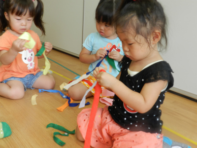 ラッコ組のお友達がベランダで水遊びをしていました。 初めのころは水に触るのも恐る恐るでしたが、今はプールの中に入ってにっこり笑顔が出るようになりました。 ペンギン組さんは実習生が新聞紙遊びをしてくれました。…