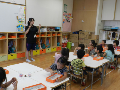 今日はライオン組で実習生のお姉さんが子どもたちと一緒に面白そうな物を作っていました☆ 説明を聞いている子どもたちは真剣な眼差し(ー_ー)!! 一体何ができるのかな? 作業を始めた子どもたちはお喋りもせず夢中…