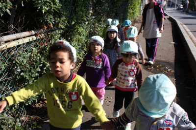 ずいぶん寒くなってきましたが、子どもたちはとても元気です。 今日はペンギン組の行動を覗いてみましょう。 今日は川沿いから治水緑地に向かってお散歩。 みんな仲良く手を繋いで歩いています。 カートに乗っている子も顔をきょろき…