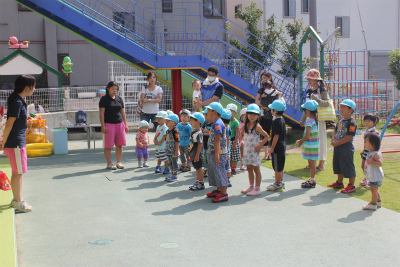 今日は雨でしたが、消防署の方々が来て下さり、避難訓練を行いました。 消防士さんのお話を聞いて、先生達は消火訓練も行いました!! 最後は消防士さんと記念撮影もしましたヽ(*´&foral…