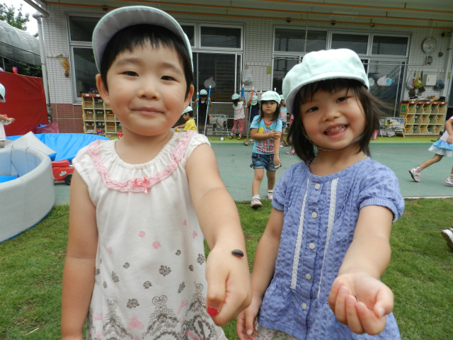 今日は朝から涼しかったのでプールには入らず、みんなで園庭遊びをしました。 パンダ組さんは虫探しがだーいすき♡ 特にダンゴムシがみんなお気に入りで捕まえると「見て見て!」と見せに来てくれました。 キリン組さんは竹馬に挑戦!…