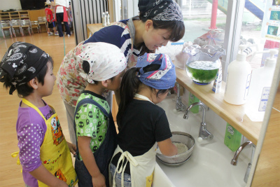 今日は、子ども達がとっても楽しみにしていた カレーパティーでした\(^o^)/ 朝から子ども達はウキウキ❤ エプロン、三角巾をつけたら準備完了です(^^♪ ライオン組はお米を研ぐところから始めました★ 上手…