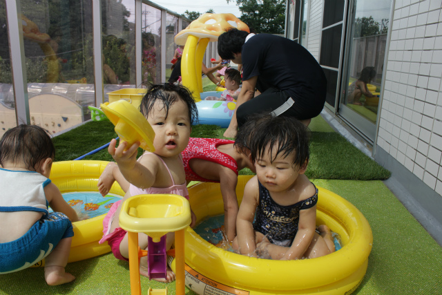 今日は、土曜日なので保育部も幼稚部も合同保育です(*^^)v ライオン組のお友達は、パンダ組のお友達のお世話をたくさんしてくれました(*^_^*) お日様も出てきて暑かったので水遊びをしましたよ♪ みんな水…