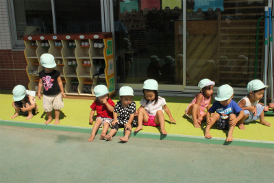 今日はイルカ組の園庭遊びを覗きに行ってきました(^^) お部屋で帽子をかぶって、靴下を履いたら準備万端!!! 先生に言われなくても水筒を取りに行き、ぶら下げています。 みんな自分の水筒がとって…